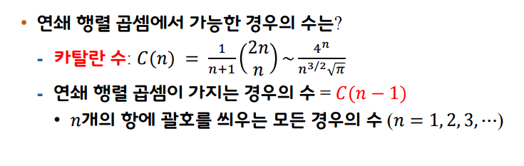 - 이 경우 앞서 연쇄행렬곱셈에서도 사용했던 카탈란수를 다시 사용하게 될 것이다.