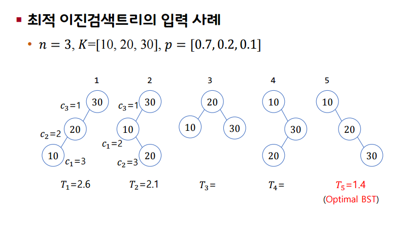 - 모든 경우의 수에 대해서 계산해 보고 최적의 이진트리를 선택한다.