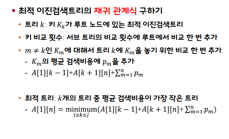 - 키 값이 일 경우, 는 이진 탐색 트리의 i부터 j 까지의 노드에 대한 최소 평균 탐색 시간