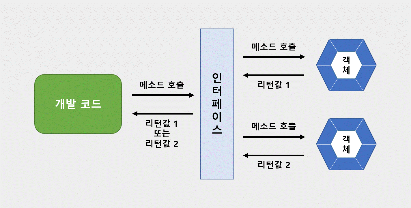 인터페이스는 코드와 인터페이스로 생성된 객체들을 중간에 중계해주는 역할을 한다. 개발 코드가 먼저 인터페이스의 메서드를 호출하면 인터페이스는 객체의 메서드를 호출시키는 형식이다.