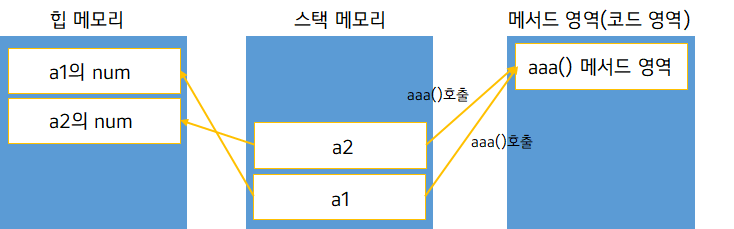 당연히 같은 결과 값을 가져온다. 이를 그림으로 도식화 해보면 메서드는 메모리에 따로 올라가는 것이 아니기 때문에 같은 메서드를 불러오는 것을 확인 할 수 있다.