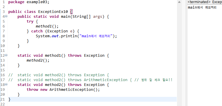 - 예외가 발생했으면 자기의 예외를 호출한 곳에 예외를 던져 주는 것이다.