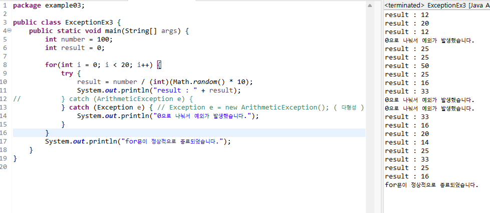 - catch 블록을 거치지 않고 try-catch문을 빠져나가서 수행을 계속한다.