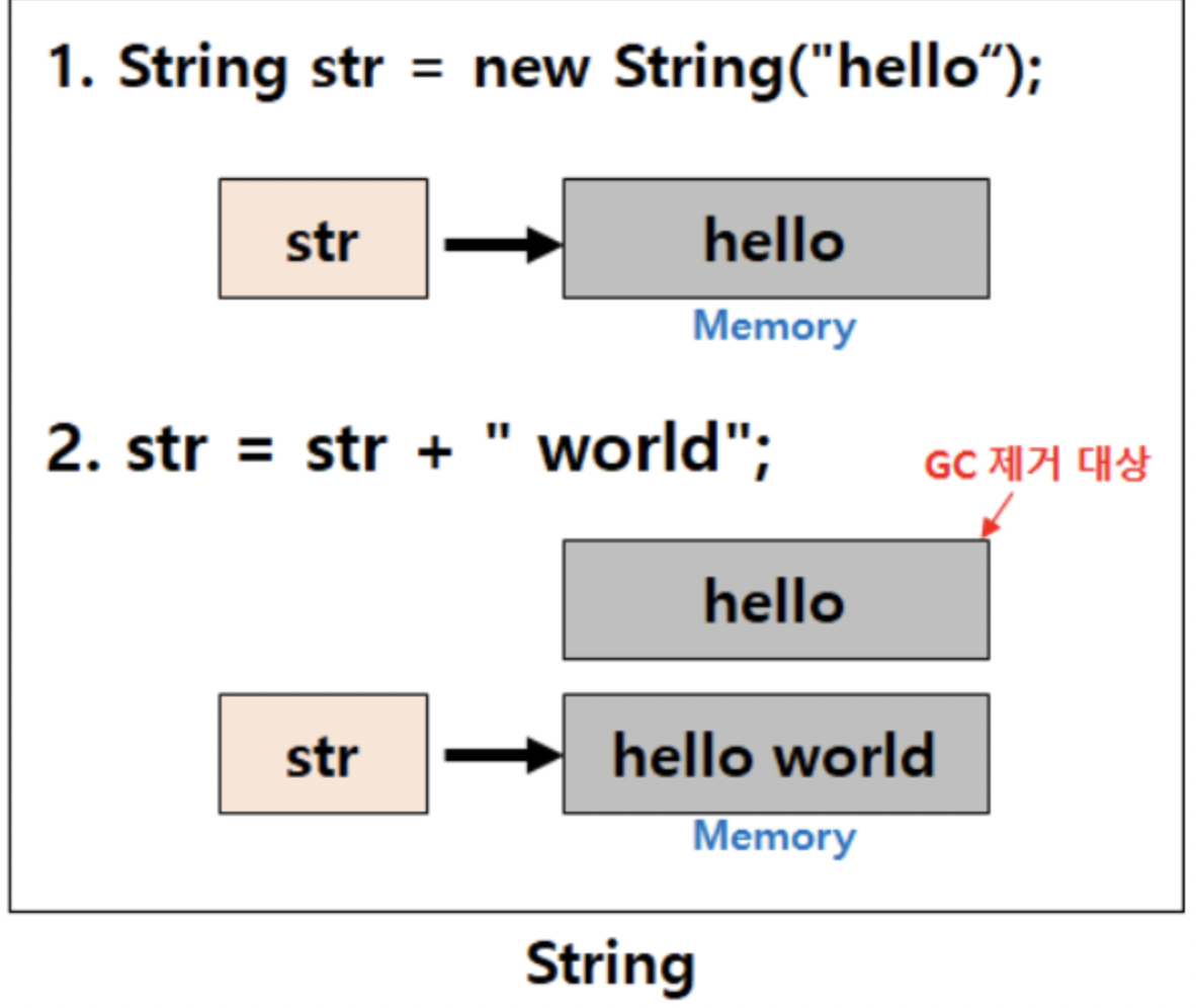 "Hello" 값이 들어있던 String 클래스의 참조변수 str이 추가된 문자열 "world"가 추가된 "Hello world"의 값으로 새로운 메모리 영역을 가리키게 변경되는 것이다. 그리고 처음에 선언했던 "Hello"로 할당된 메모리 영역은 갈비지 콜렉터에의해 사라지게된다.