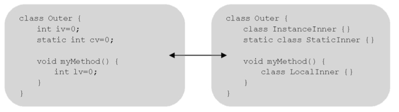 위 코드에서 인스턴스 클래스(instance class)와 스태틱 클래스(static inner)는 외부 클래스(Outer)의 멤버 변수(인스턴스 변수와 클래스 변수)와 같은 위치에 선언되며, 또한 멤버 변수와 같은 성질을 갖습니다. 따라서 내부 클래스가 외부 클래스의 멤버와 같이 간주되고, 인스턴스 멤버와 static멤버 간의 규칙이 내부 클래스에도 똑같이 적용됩니다.