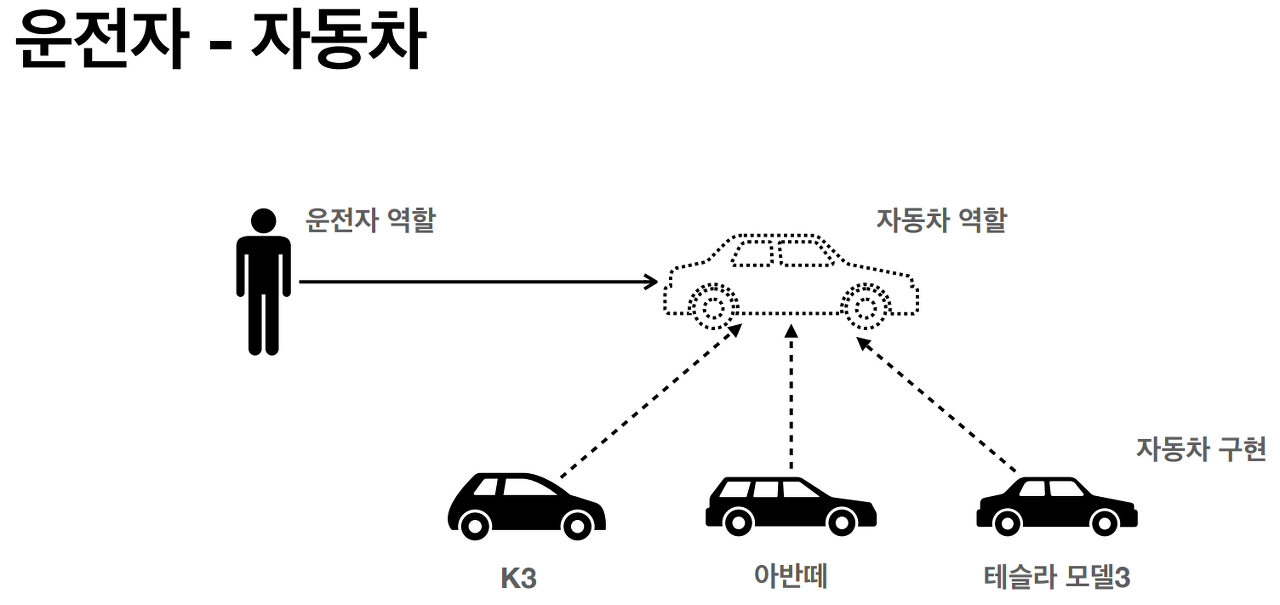 이렇게 역할이 있다고 가정하자. 차 종이 바뀌었다고 해서 운전자가 매번 라이센스를 갱신해야하는 것도 아니고, 로미오와 줄리엣 공연을 특정 여배우/남배우만 할 수 있는게 아니다. 이것이 가능한 이유는 역할과 구현을 분리했기 때문이다.