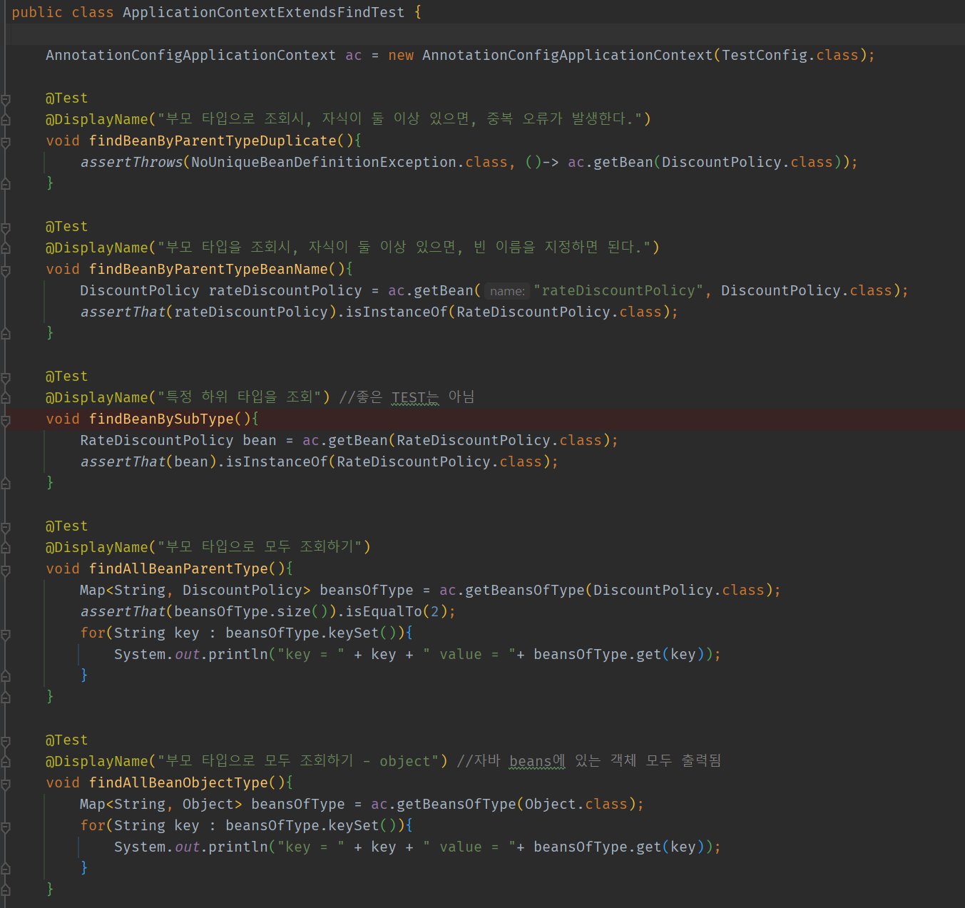 assertThrows(NoUniqueBeanDefinitionException.class, ()-> ac.getBean(DiscountPolicy.class));