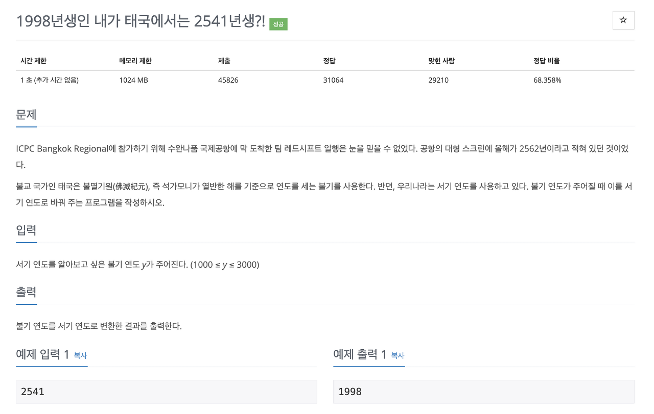 998년생(서기)의 경우 불기로는 2541년생이다. 서기와 불기는 543년 차이가 있음을 알 수 있다. 불기가 주어졌을 때, 주어진 불기에 543년을 빼주면 서기를 구할 수 있다.